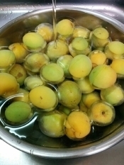 Midori 水分が上がってくるまで毎日ひっくり返します 塩漬け 塩抜き はちみつ漬け というやり方で作ろうと思ってましたが 最初から塩とはちみつで漬ける という超簡単法を見つけたので そっちにしました 一晩置いたところ 梅干し 梅